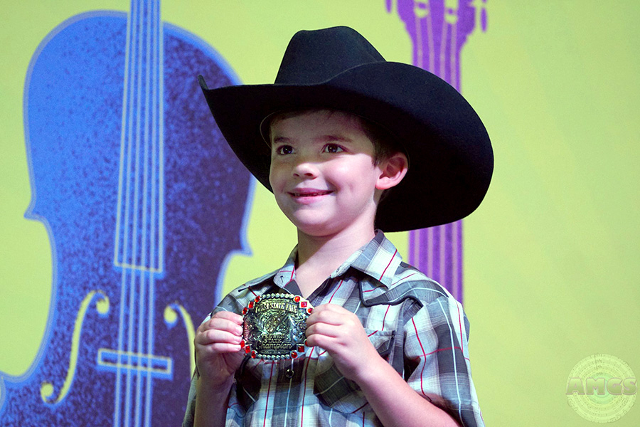 The contest kicked off on the chime at 11:00 a.m. (well it was a little later), and the Pee Wee division (under 8) started the day off with 6 contestants. First place of this division went to Tristin Paskvan, from Southlake, TX. With his toothy grin, the lad took home a ruby encrusted belt buckle, which happened to be almost as big as his hat, and a $50 bill. “My guitar player said it may not be real ruby, but if it’s not we are going to get real ones,” Trustin shared. With contestants representing states from Oklahoma, Missouri, and Texas, the skill level was quite high. First grader, Paskvan takes lesson from Sherrie McKenzie. “What do you like most about playing the fiddle?” I asked him. “Mainly it’s the girls,” the young man said. When asked who he looked up to, as a fiddler, that is, and without hesitation he said “Ridge…the guitar player…he is cool.” Coming in at 2nd, Kolton Buttress, Summersville, MO, put $30 in his wallet.