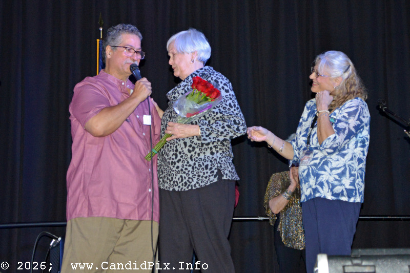 Ernie also brought a special guest to the stage. Judy Adams, who promoted this festival for years with her husband, Norman, was on hand for the festival. Ernie and Debi presented her with a bouquet of roses. She is the “first lady” of bluegrass promoters!