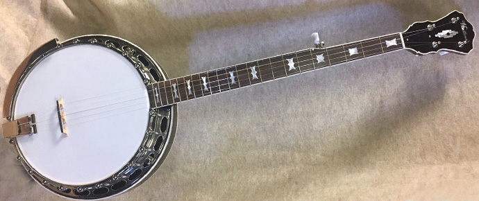 The RB-7 that I examined has a Huber Vintage ring on a Cox rim, with a carved resonator from Clancy Mullins. Like all top tension models, it is slightly heavier than most Mastertone banjos, owing both to the extra weight in the hoop and resonator. The tone is quick and very responsive, however, and it should open up into a fine five once it has been played in.