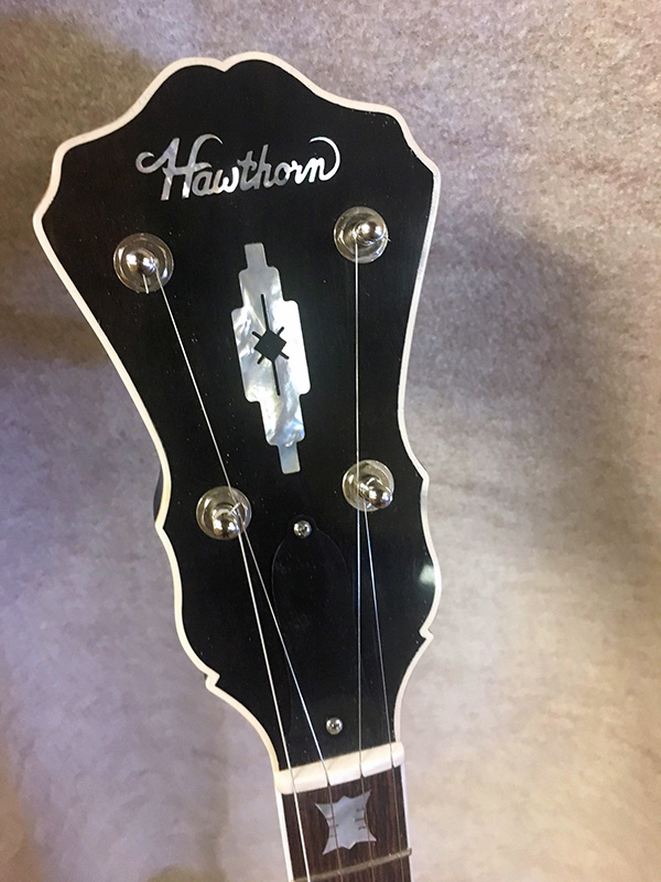 The Hawthorn is a very attractive banjo as well. The bound headstock follows the same pattern that Gibson used on the style 7, but with the Chrysler building inlay in the center like the style 12, and, of course, the Hawthorn name. Glenn has also replicated the Bow Tie fingerboard pattern on the bound rosewood neck, not the somewhat simplified inlay used later on the RB-250, but with the cuts along the side of the ties like the old 7s. Both the nickel plating on the metal parts and the finish on the figured maple neck and resonator sparkle under the lights.