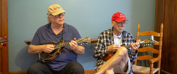 Tom Mindte and Tom Jarboe join the jam at Tom Mindte's Pickin' Party (10/6/18) - photo by Jeromie Stephens Each year Tom Mindte, who runs Patuxent Records in Maryland, hosts a weekend-long pickin' party with his friends, Rodger Nelson and Steve Benedik.