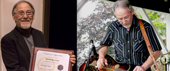 Roger Williams with his award - photo © David Hollender/Roger performing on stage - photo by David Malloy Most, if not all, bluegrass music associations reward those who have excelled in their field. Almost two weeks ago, the Boston Bluegrass Union (BBU), which