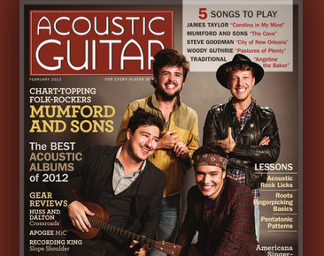 The February edition of Acoustic Guitar magazine is now available from news stores. The main attraction is the cover story of much-vaunted Mumford And Sons, described by the magazine as Chart-Topping Folk-Rockers, but embraced as well by bluegrass fans who inhabit