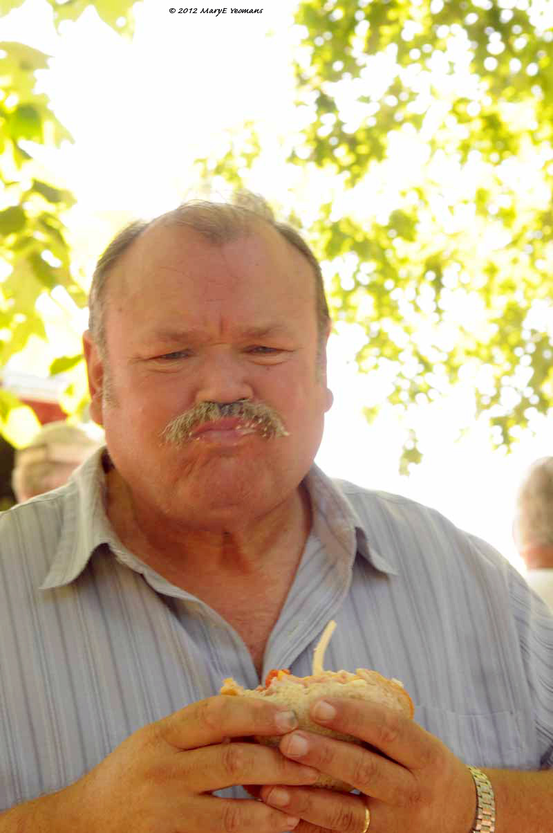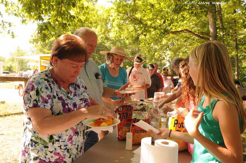 Friday evening Bean Blossom attendees have a lot to keep busy apart from the shows onstage. A few years ago James King decided to show appreciation for his fans by serving up a free dinner for them. He called this “‘Mater Sammich Time” and now it is a tradition. James and wife Julie along with several helpers serve up bologna and cheese with ripe tomatoes and Duke’s mayonnaise between two slices of white bread. Fans line up for an hour to get one of these (yummy) sammiches. The line snakes down the hill past old rattletraps that Bill and Birch used to drive around the grounds. One thing’s for sure: the fans appreciate and enjoy every bite of the sammiches – good groceries!