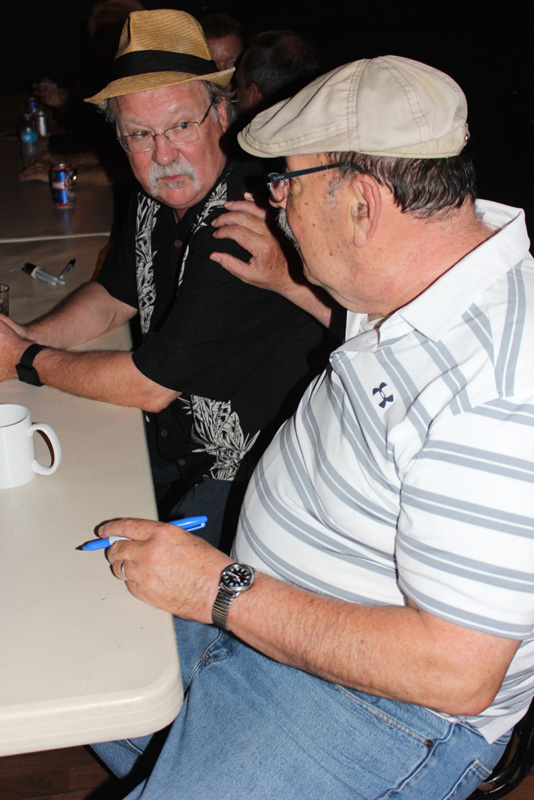 Dudley Connell with Ben Eldridge after his final Seldom Scene performance (July 16, 2016) - photo by David MorrisFor the encore, you’d sit through a parody song pulled together by Dudley Connell – so new that music stands were necessary to hold copies of the lyrics – Benny Boy, the Banjo Boy. You’d gamely play along for a bit, then stop to wipe your eyes, and watch during the chorus as the crowd followed Dudley’s lead to lift their glasses in a toast that ended with this: