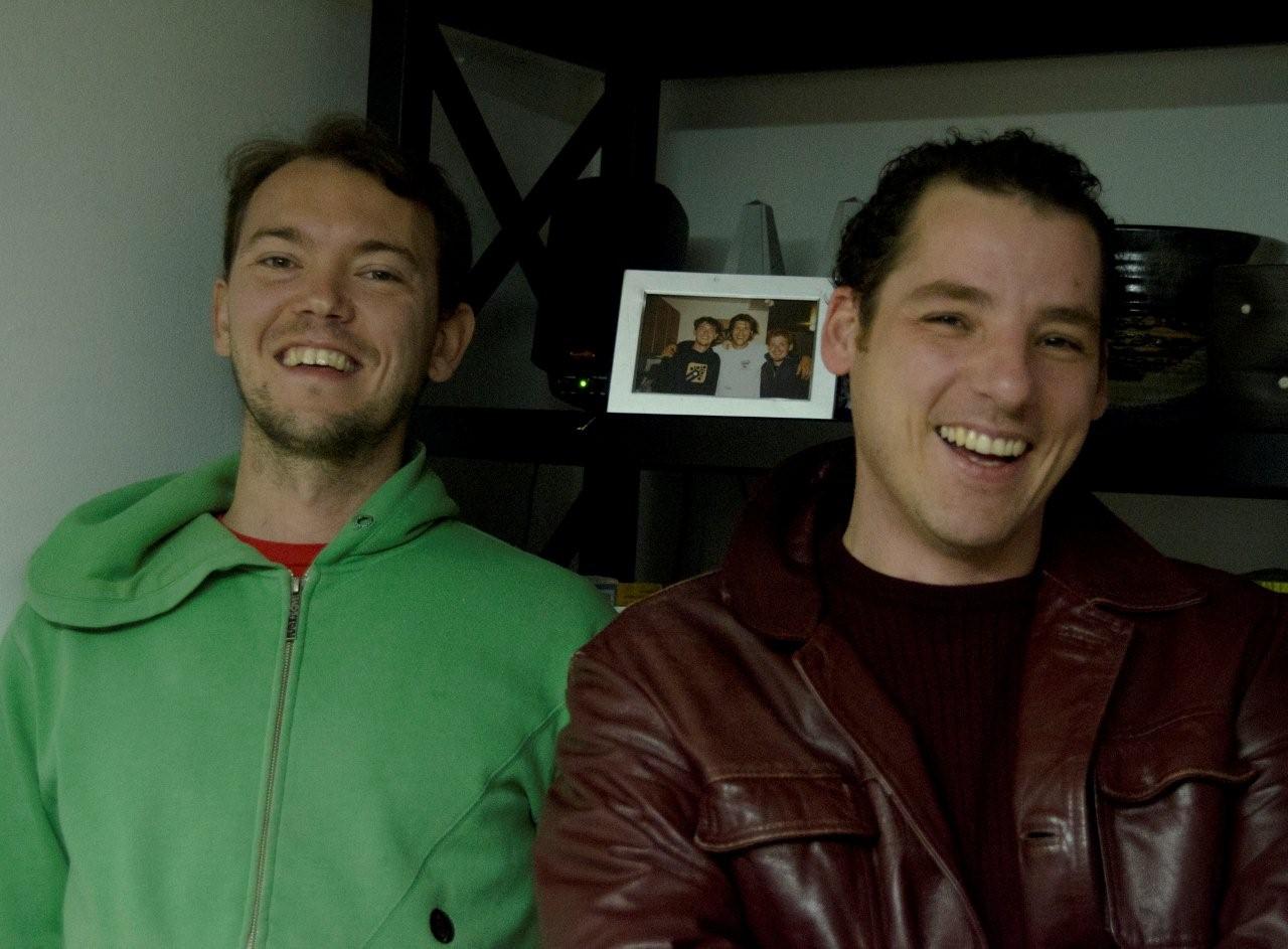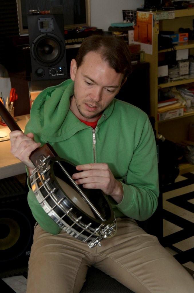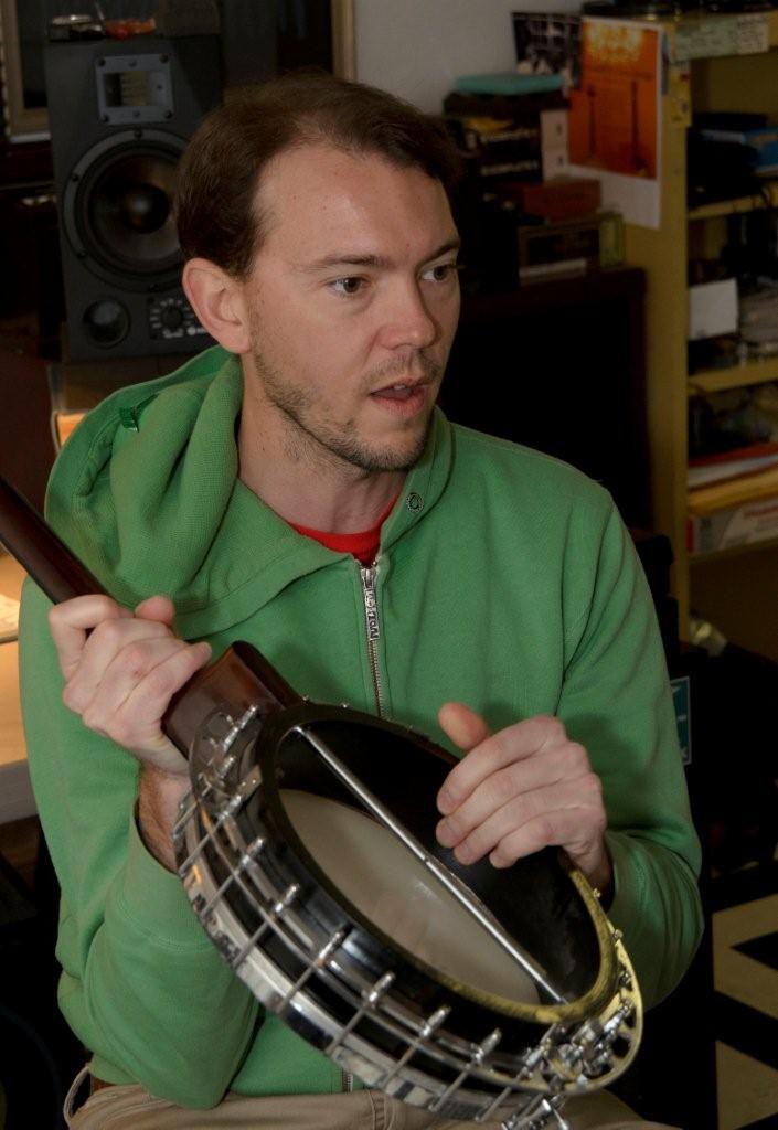 Andy walks in and Chris starts explaining why one of the banjos is so cool “Look inside here! See this? It’s all wood inside! And this is FIVE ply…not three or four ply!” Chris hands Andy a banjo and tells him to check it out. Andy starts playing the banjo and Milo makes himself comfortable to do their interview.