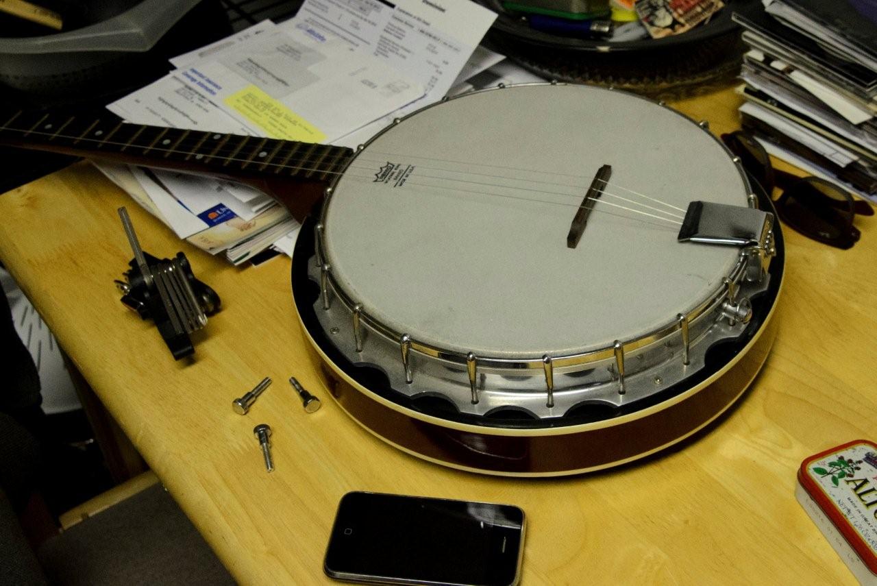 Chris lives in an apartment off of the Downtown Mall which is one part gypsy minstrel workshop and one part electronic mad scientist’s lab. There are dismantled banjos and other instruments strewn on couches and chairs and multiple computer screens flashing hard drives transferring terabytes of streaming video to multiple computers.