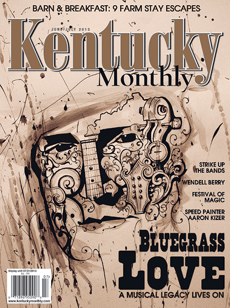 The magazine has commissioned celebrated artist and Owensboro native Aaron Kizer, who has produced a stylized portrait of Bill Monroe to serve as the cover of their June/July 2013 issue. The poster was created with ink and watered-down wall paint, and 10 numbered and signed commemorative prints will be offered as prizes during ROMP, which occurs June 27-29.