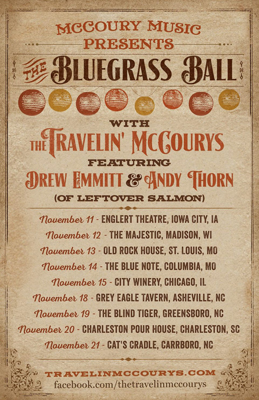 But for their November Bluegrass Ball guests will be Drew Emmitt and Andy Thorn, mandolinist and banjo picker respectively from Leftover Salmon. They will perform as an opening duo on the ten-day tour, and then jam with the McCourys after.