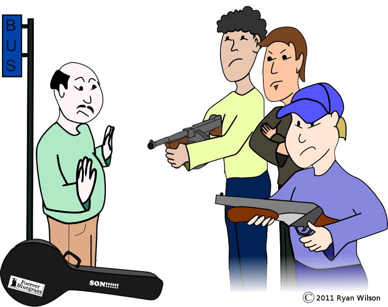 It usually involves taking the victim aside to a quiet place, to the corner of a truckstop restaurant for example, having a pleasant conversation about nothing in particular (“You’re a nice guy. I like workin’ witchoo.”), then, just as the check arrives, the victim is handed a bus ticket home and is left to wait for the Greyhound arriving there later that day (or next Thursday). This scenario can also play out at an airport, with the soon-to-be ex-band member handed a plane ticket home.These are the kinder versions. In the less kind version, the boss asks his victim to wait there while he goes to the bathroom. The boss goes instead to the bus and leaves the poor musician stranded there with no ticket home, no money, and probably the check for lunch. In the extreme version, the victim is pushed out of the bus on to the side of the highway, accompanied by most–but not all–of his/her belongings. This “thing of ours” called bluegrass can be a harsh business.