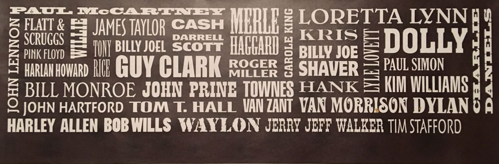 Not only is he back to work and doing well, he just completed a 400 hour-plus job in his off time – an art piece appropriately titled the “The Wall of Names” in the man cave across from his home studio. While recuperating at home in the winter of 2015, he was inspired to create a tribute to the musicians and songwriters who have influenced him throughout the years.