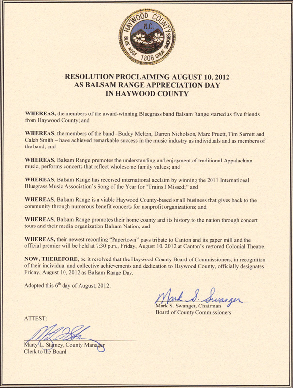 Balsam Range Day proclamationMayor Ray presented each member of Balsam Range with a key to the City of Canton, thanking them for their many contributions both professionally and personally to the city. Mayor Ray also gave thanks for them “not forgetting where they came from,” and for titling their new CD Papertown. Mayor Ray went on to thank them for starting their winter concert series two years ago at the Colonial Theater in Canton, bringing both revenue and recognition to Canton.
