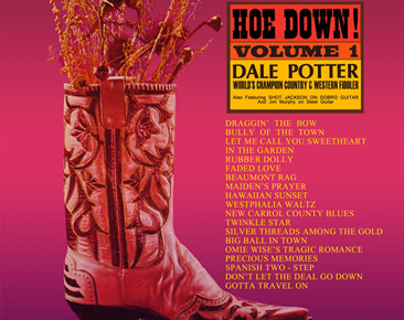 From 1967 comes Hoe Down! Volume 1 by Dale Potter, which includes 20 country and bluegrass fiddle favorites, performed with a traditional country band. All are brief arrangements, many under 2 minutes, with Shot Jackson on resonator guitar and Jim Murphy on pedal steel. The three of them pick through such classics as Rubber Dolly, Maiden’s Prayer, Beaumont Rag, Twinkle Twinkle Little Star, Don’t Let Your Deal Go Down, and Bully of the Town among them.