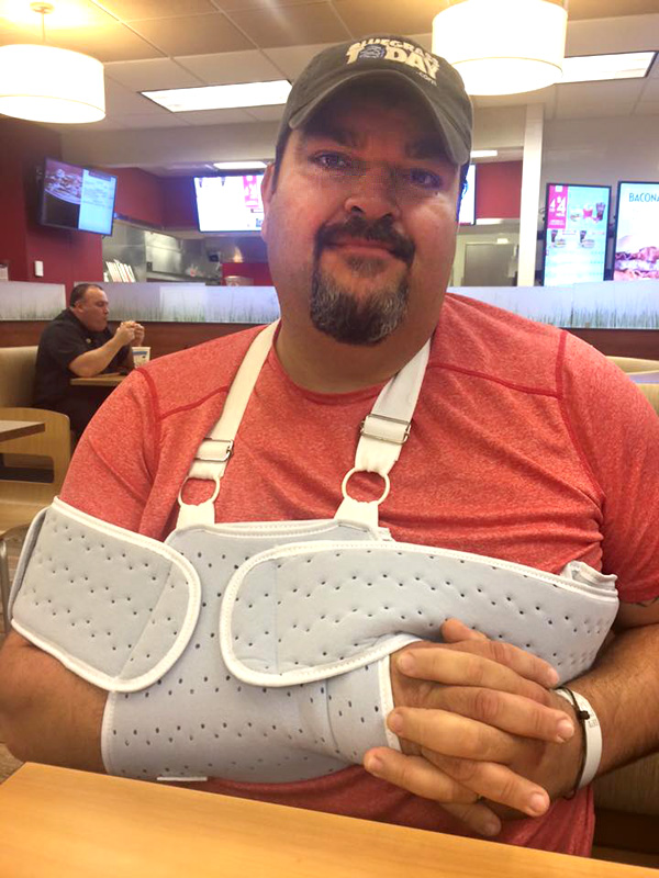 When we caught up with him this afternoon, he reported a good deal of pain and soreness, but that he was fortunate to have his wife, Katrina (an RN) at home caring for him. He’s wearing a sling and swathe to keep the shoulder still, but said that he can’t remain in any one position long before it starts to hurt.
