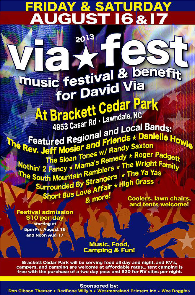 His many friends in the music world have put together a benefit festival, Via Fest, scheduled for August 16-17 in Lawndale, NC. Music will run all day each day, with 15 bands providing entertainment. Proceeds will go to help David with his medical expenses, and the loss of income from being unable to perform for some time.