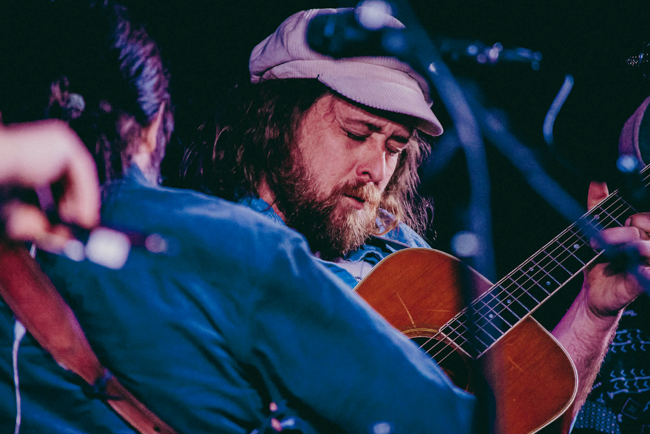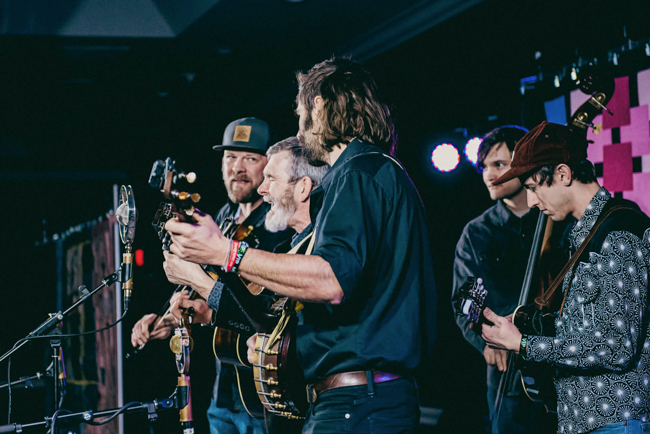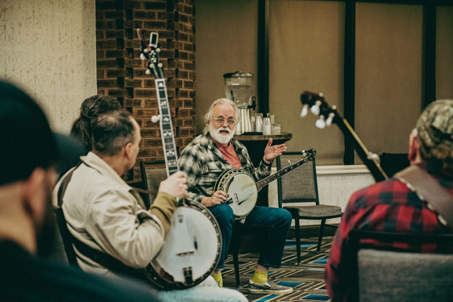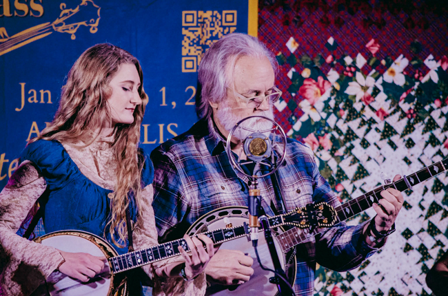 Danny Paisley enjoys the banjo of Braden DeGarmo at Winter Bluegrass – photo © Tina Heil