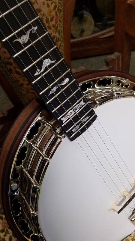 The Julia Belle, named for Hartford’s song Julia Belle Swain from his 1976 album, Mark Twang, recalls John’s use of a low-tuned banjo in most of his recordings. He initially favored a banjo tuned to open E to suit his deep voice, but the sound of the growly, low-tuned banjo eventually came to define his sound as much as his on-stage dancing while he played.