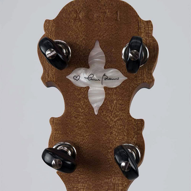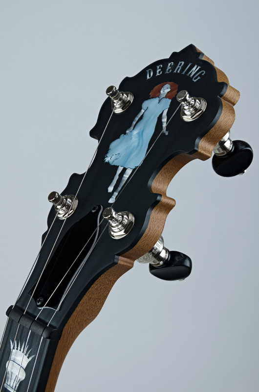 Alison actually owns the prototype model that had been John’s, as she had been a close friend of his during his life, and remains close with his family to this day. So when her idea for a special banjo for herself became clear in her mind, she knew that she wanted Deering to do it. Her vision involved the elongated fret scale, and the low tuning, with the radiused fingerboard that she prefers. But she wanted it to be a mahogany banjo instead of maple, with inlays based on Hartford’s original artwork.