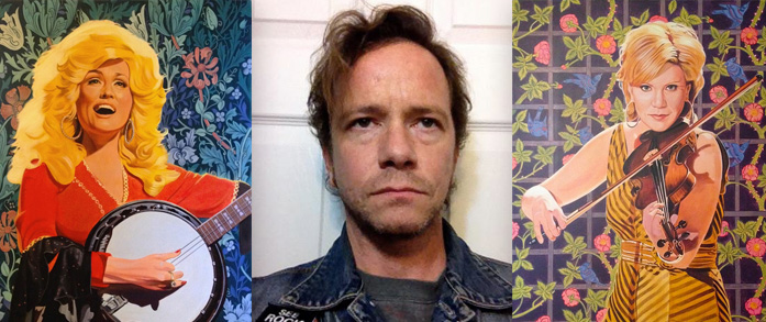Nashville artist Scott Guion (center) with his portraits of Dolly Parton and Alison Krauss