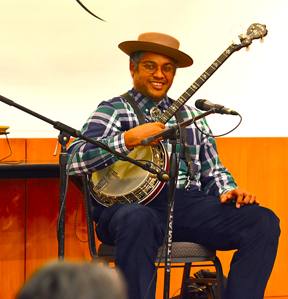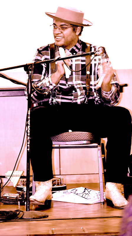 With his extremely unique clawhammer variant on a four string banjo, Flemons shares that he spent countless hours researching styles of playing at the local library. “Rhythm can be heard but not seen. I had no idea that to play rhythm on a banjo, you had to have 5 strings.” Flemons picks a 4 string with a double thumbing style. The tuning he uses is also unique for a tenor banjo. The American Songster utilizes an open G tuning, that he picked up from his guitar playing.