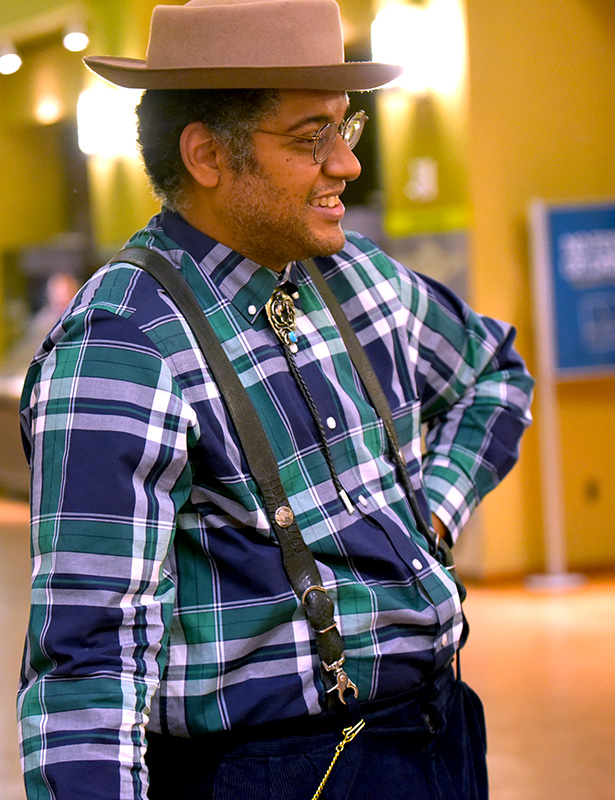 Dressing in the manner of a vaudeville performer is definitely in his bones. Dom is a huge fan of silent movies, and that is where the stage dress of the American Songster began. He attempts to keep his look the same so people will always know what to expect. Donning a plaid shirt, similar to the Kingston Trio wore in the ’60s, was chosen because of the simplicity of colors and ease of purchase from a regular department store. Corduroy pants gave him a dressier appearance versus blue jeans, (cuffed and pleated), but once again, easy to purchase. Plus suspenders and a hat that he first purchased in Australia. He referred to it as a Kubra, the Stetson of Australia. This iconic style sums up Dom Flemons, but after spending several hours with him at the Museum, I found that there was much more to Dom than a plaid shirt, corduroys, suspenders, and an Aussie hat.