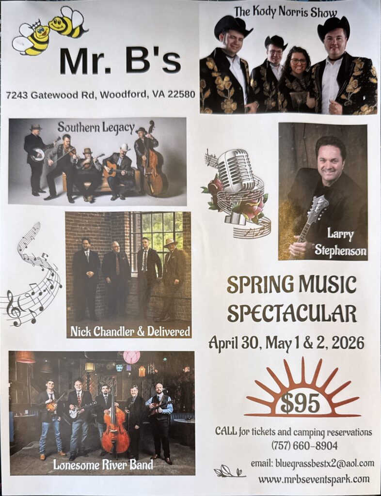 Mr. B’s Event Park presents Mr. B’s Music Spectacular April 30, May 1 & 2, 2026. Featured bands performing: Lonesome River…