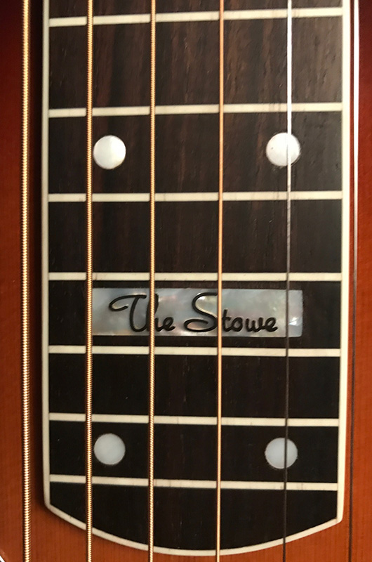 After several months of tweaking his design ideas, Ferrell felt confident that it was time to try these ideas in one of our RedLine Resophonic Guitars. To take it a step further, we collectively agreed to make an all new model, which we call ‘The Stowe.’ We used Ferrell’s circa 1930’s Model 27 Dobro as sort of a visual guide when designing this model. We did our best to match the sunburst on his guitar, and all of the other specs were pretty much in place. Further, Ferrell had some specific ideas as to what woods we should use, so we wound up using western red cedar for the top, book-matched east Indian rosewood for the back and sides, and walnut for the neck. The fretboard and headstock overlay are also east Indian rosewood. The top of the body and fretboard are bound in ivoroid celluloid. The finish is a gloss nitrocellulose lacquer. Fretboard dots are mother-of-pearl, as is the handsome ‘The Stowe’ engraved name-block on the fretboard.