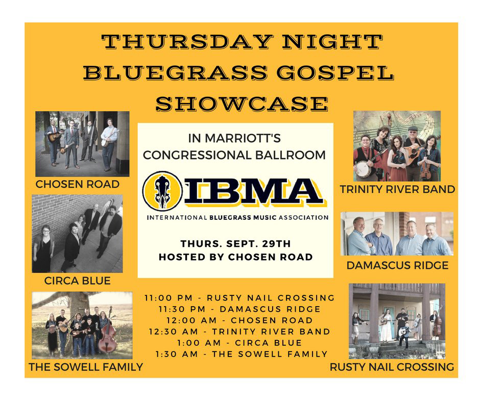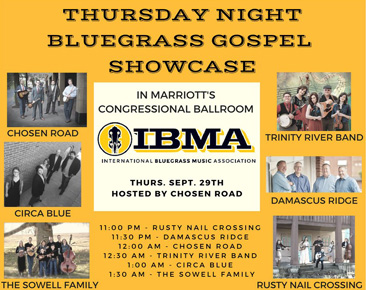 Thursday’s showcase will be hosted by Chosen Road, beginning at 11:00 p.m., with additional performances by Trinity River Band, Damascus Ridge, Rusty Nail Crossing, Circa Blue, and The Sowell Family.