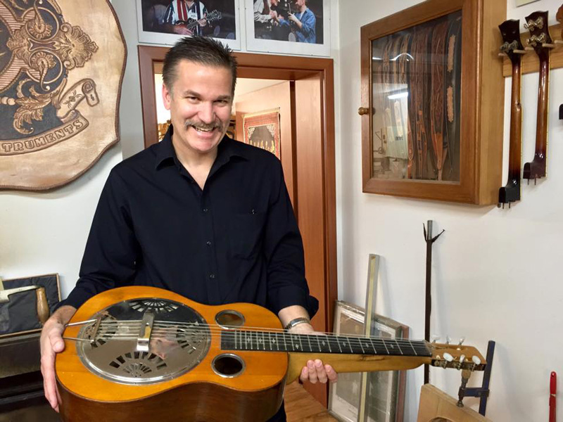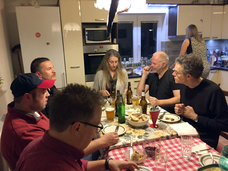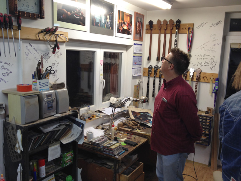 Day 2: The rest of the Night Drivers arrived, with the exception of Mark Stoffel, who’s schedule wouldn’t permit him to make the Prague concert, so he was replaced by a stellar mandolin player from the Czech Republic—and a former “Czech Driver”—Zdenek Jahoda. Our hosts and the promoters of the concert were renowned Czech instrument maker Rosta Capek and his partner Ivana Loukova, and they invited us to visit the workshop. We also had a wonderful traditional Czech meal. Rob Ickes and Trey Hensley were performing with us, so they were along for the meal and shop tour. Rosta is showing Rob one of the Dopyera Brothers’ very first resonator guitars (the neck is hollow).