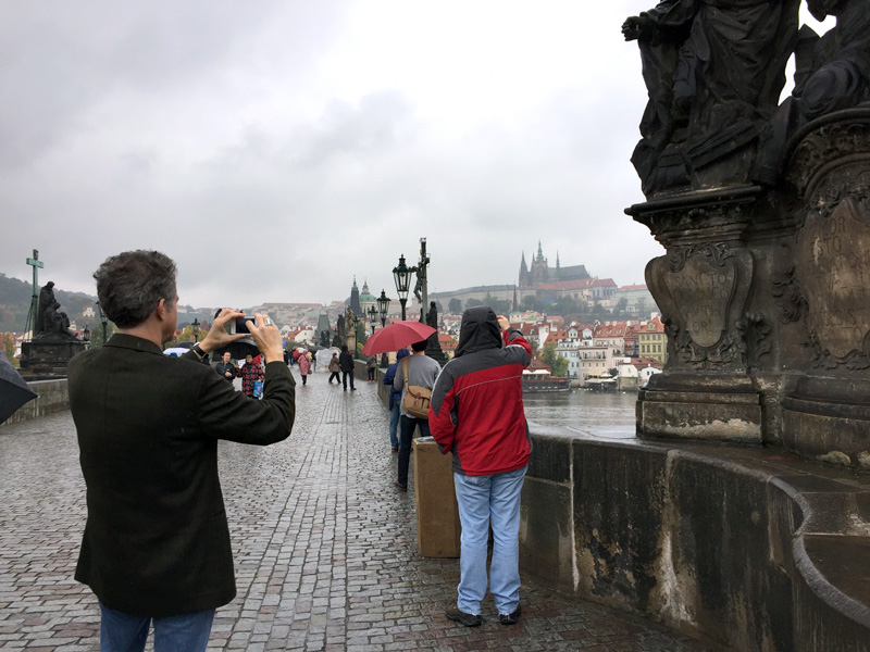 Day 3: Day of the concert: In spite of the rain, Ned Luberecki, Jon Weisberger, and I got back on the tram to ride to the downtown area and the Charles Bridge. It doesn’t get more touristy than taking a photo of another band member taking a photo of another band member taking a photo.
