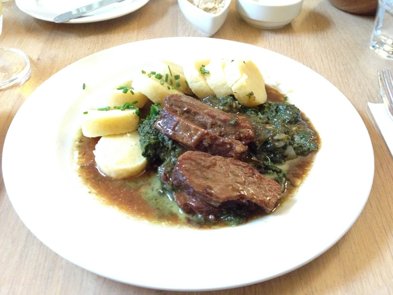 Beef on spinach with potato dumplings in PragueThen, of course, there was more food photography. This was some amazing beef on spinach with potato dumplings. I’d have taken some back to North America, but it wouldn’t have been practical or legal.