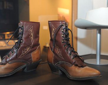 They include Miss Dixie’s fancy boots pictured above, and this image of Museum Executive Director Chris Joslin with Tom T.’s iconic black guitar, made for him by the Ovation Guitar Company. It was the first black guitar they had built, and they did so custom for Tom. He played that guitar for many years on stages all over the world, and has graciously loaned it to the Museum for the year.