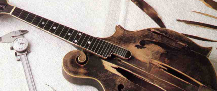 And we’re not talking about a spruce-up here. The top of the mandolin had been smashed with a fireplace poker in an act of vengeful vandalism, which also left major cracks and breaks in the back and the headstock. When Monroe discovered it at his home, he is said to have despaired of ever having it in playing condition again.
