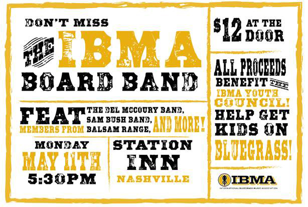 Well anyone who’s in Nashville on May 11 will have an opportunity to catch The IBMA Board Band perform a special show at 5:30 p.m. at the Station Inn. On stage will be Alan Bartram, Becky Buller, Danny Clark, John Goad, Stephen Mougin, Joe Mullins, Tim Surrett, and Jon Weisberger. Special guests may appear, and fellow Board member Ben Surratt will handle the audio.