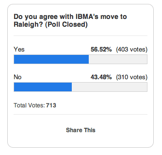 Thanks to all the readers who participated in our poll this past five days. We had asked for your feedback regarding the decision by the International Bluegrass Music Association to move its signature events, World of Bluegrass and Fan Fest from Nashville to Raleigh, NC for the years 2013-2015.