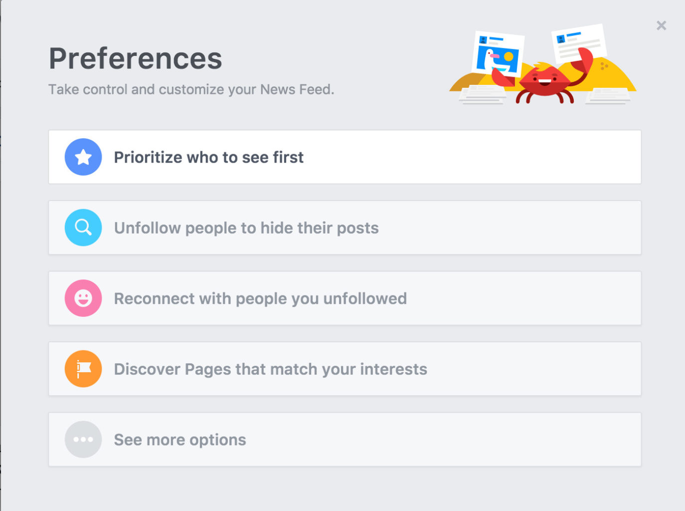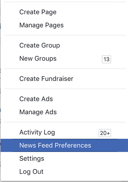 Highlight the menu option that reads News Feed Preferences, and select that one. That will bring up a pop-up window with five preference options.