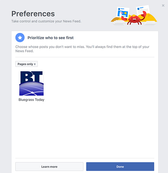 Click the top one, Prioritize Who To See First, and another window will appear that shows all of your friends and pages you have liked, such as Bluegrass Today. To make it a bit easier, click on the small menu that says All, and change it to Pages Only. If you have already liked Bluegrass Today on Facebook, or our old page for The Bluegrass Blog, it will appear in the window. Click the icon for our page and a blue star will show up over it, indicating that our posts will show up first on your feed.