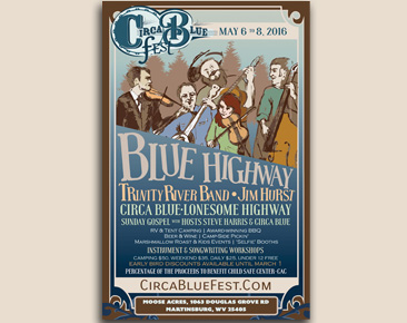 Circa Blue Fest, scheduled for May 6-8, 2016, will be hosted in cooperation with The Child Safe Center, an anti-child abuse organization who will benefit from the proceeds of the festival. The event will be held at Moose Acres, a 40 acre campground located in the eastern panhandle of West Virginia, a short distance from major population centers in Virginia, Maryland, Pennsylvania, and the District of Columbia.