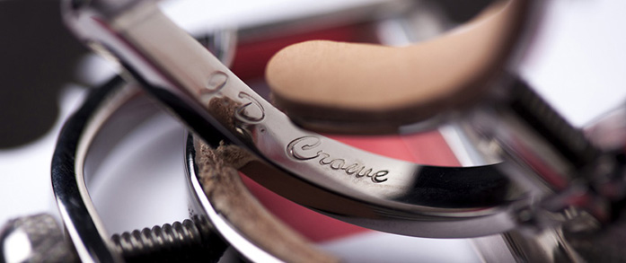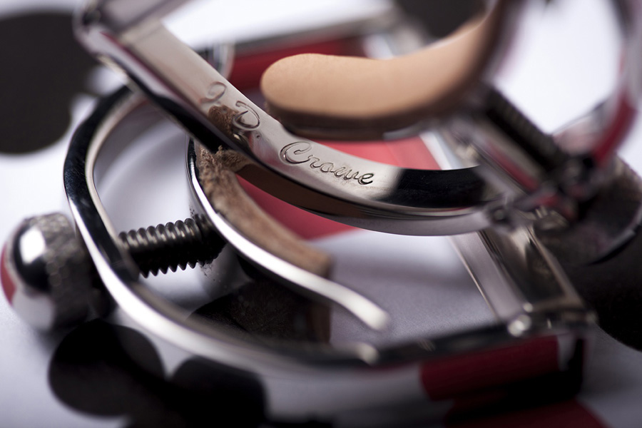 This is a stainless steel device of the highest quality and is available in a number of top bar widths, for either flat or radiuses fingerboards. It is offered with either the forked saddle, as in the capo Crowe has used for years, or with the smaller, McKinney-style saddle that may be more familiar to modern players.