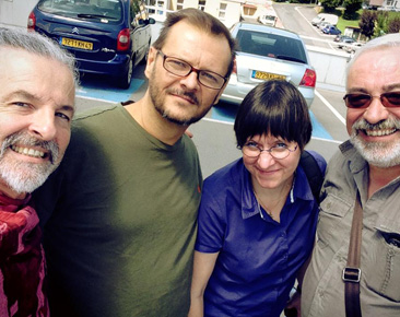 Jean-Marc Delon, Jason Burleson, Barbara Defix, and Henri Gorgeus pick up Jason Burleson at the hospitalWe are delighted to report that Jason Burleson has been released from the hospital in Le Puy en Velay, France, and has been reunited with his Blue Highway brethren at the La Roche Bluegrass Festival.
