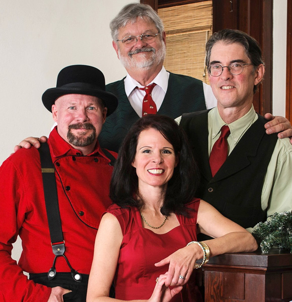 Kathy sings lead and plays bass with Tim Crosby on fiddle and mandolin, Tom Tower on banjo and reso-guitar, and Dennis Nelson on guitar.