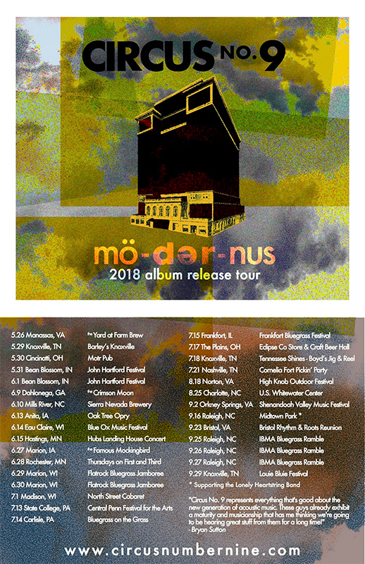 Circus No 9, a relatively new progressive string band based in Knoxville, has released a video of a live performance of the song, Lost Mule In Texas. The quartet is among the bands selected to showcase this September as a part of the Bluegrass Ramble during the World Of Bluegrass convention in Raleigh, NC.