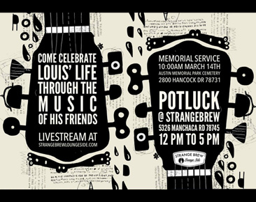 This afternoon’s remembrance follows his graveside memorial service this morning at Austin Memorial Park Cemetery. Family and friends are gathering from noon to 5:00 p.m. (CDT) at Strange Brew Lounge Side in South Austin. A live Internet broadcast of this event will be broadcast online by gigity.tv.