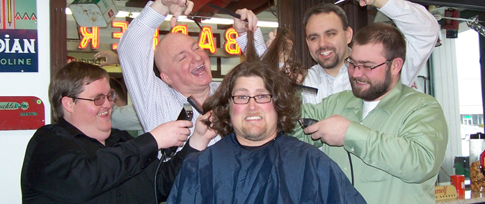 And so it has come to pass. The Facebook page is now up to more than 5200 likes, and Nathan has submitted to his shearing. He and his wife, Steffani, traveled to Middletown, KY over the weekend for a visit to Warren’s On Route 60 barbershop. There they were met by Michael and his dad, and fellow Flamekeeper Josh Richards.