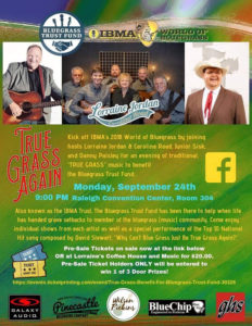 The benefit is billed as the True Grass Benefit for Bluegrass Trust Fund, and will be held in Room 304 of the Raleigh Convention Center starting at 9:00 p.m. Performers include Lorraine Jordan & Carolina Road, with Danny Paisley and Junior Sisk. The artists are donating their time so that all proceeds can go directly to the Trust Fund. Advance tickets are available for $20 online.