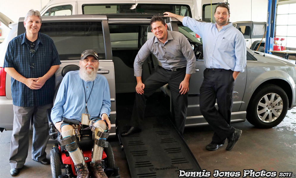 But he is mighty proud of his new Chrysler mini van, fitted with the latest in wheelchair-accessible technology. This mechanical wonder gives Jones the freedom to travel wherever he may, without the need for anyone’s assistance. He had been driving a truck with hand controls, but he often needed help getting in and out.