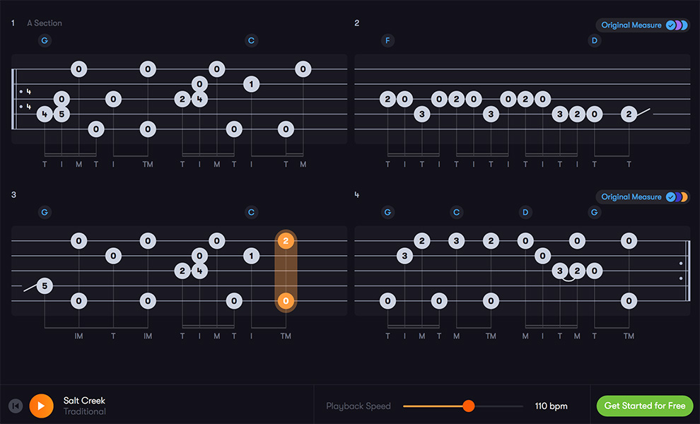 Each tab is offered with variations, typically with a simple arrangement for beginners and a more advanced version, often in a different style. For example, banjo pieces will have a basic, Scruggs-style tab and a melodic version to choose between. Banjo tabs generally have some backup suggestions as well, also presented in tab. For guitar and mandolin, a beginner, intermediate, and advanced arrangement can be selected for each tune.