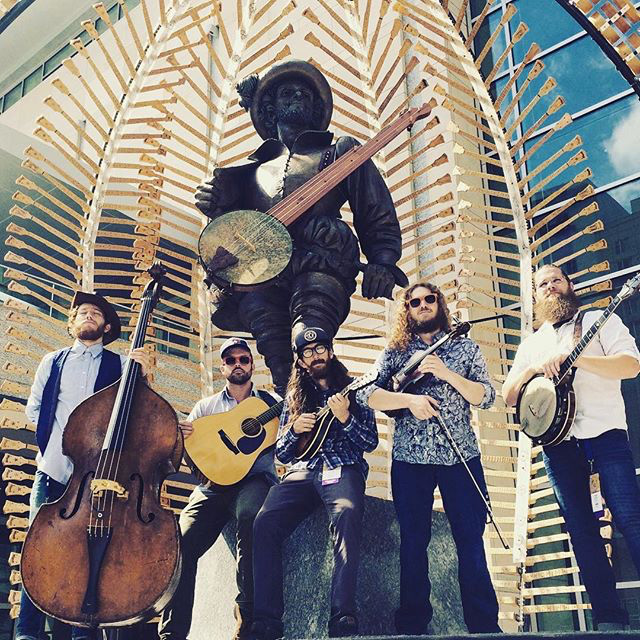 They are John Brighton on fiddle and mandolin, Jesse Farrar on bass and guitar, Ryan Murphy on banjo, Justin Wallace on mandolin and guitar, and newest member Rob Kindle on guitar. Everybody sings.