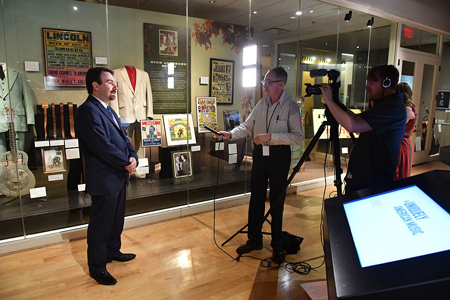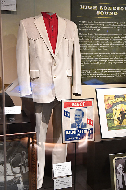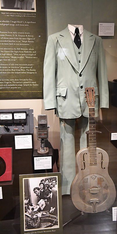 The family and invited guests got the first tour of the exhibit and the many personal items on display. The banjo and guitar which The Stanley Brothers used for the earliest Stanley Brothers recordings are on exhibit, along with some of Ralph’s stage clothes, instrument straps, and some of the actual microphones used to record the Farm and Fun Time Hour radio programs which featured the Stanleys in the 1950s in Bristol, VA.