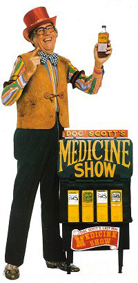 By the late 1970s he began to emphasize the medicine show element and, although ‘Doc’ Scott’s Last Real Old Time Medicine Show became a parody of the original format, he gained some recognition as a cultural preservationist. Patrons bought the specially bottled “snake oil” as souvenirs.